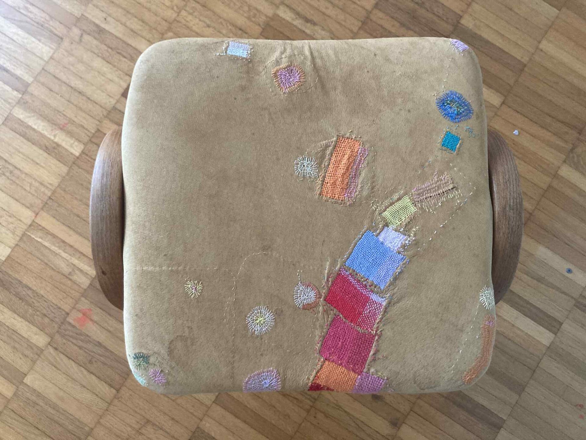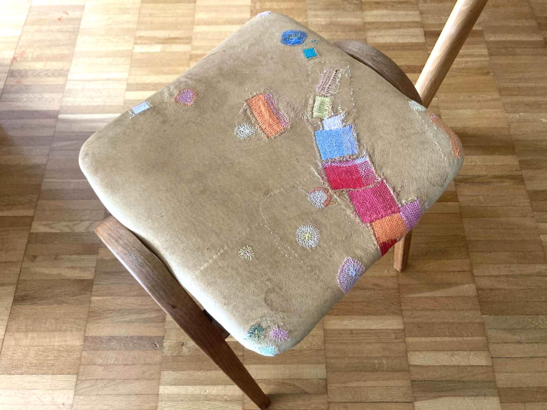 かなり傷んでいたスツール、どう修理しようか迷っていたのですが、ダーニングできたおかげで、前よりもさらにお気に入りのスツールになりました。