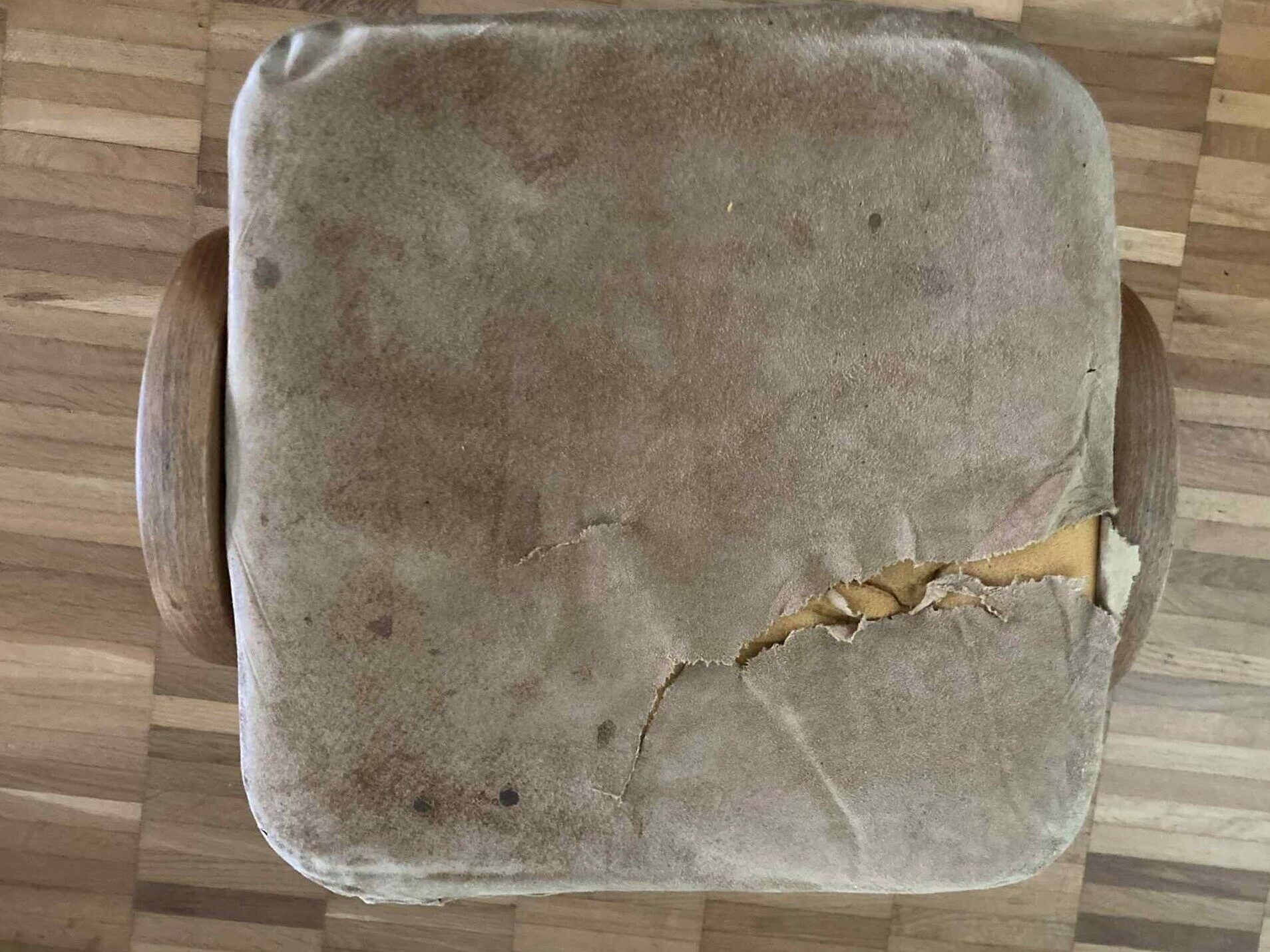 座面の革が破れて、中のウレタンフォームがはみ出てしまったお気に入りのスツールをダーニングで補修しました。